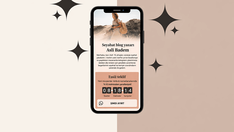 Taplink’in yapay zekâ oluşturucusu, işletmeniz için 10 saniye içinde bir link in bio sayfası oluşturacaktır. Ücretsiz planda mevcuttur, kredi kartı gerekmez.
